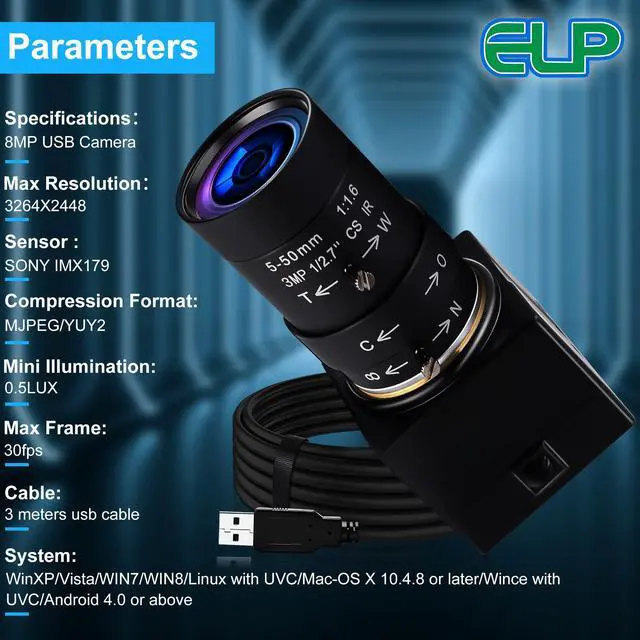 Camera Focus Adjustable: Webcamera_usb usb camera with adjust range of angle, 8MP Full HD 2448p 5-50mm 10X optical zoom webcam can meet most capturing and video requirements, High resolution 5 megapixel web camera with imx179 image sensor, Equipped with 3 meters usb cable, Support otg optional.