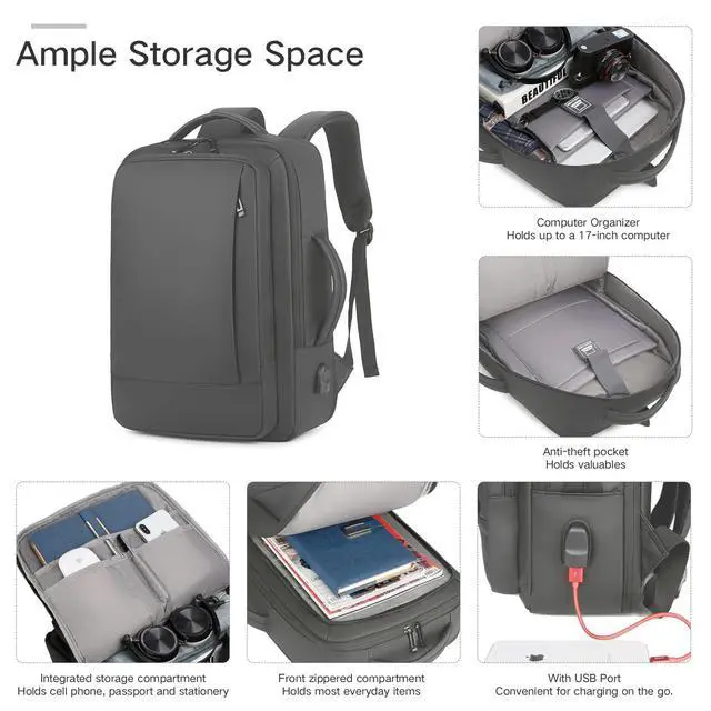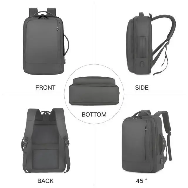 ROOMY CAPACITY & SMART ORGANIZATION: The laptop backpack's dimensions before expansion are 17 x 12.6 x 4 (0.85 kg), and after expansion, it is 17 x 12.6 x 6. It holds a 15.6 laptop, iPad, clothes, shoes, toiletries, and accessories. Water-resistant material protects essentials, while dedicated slots keep pens, wallets, and bottles easily accessible.