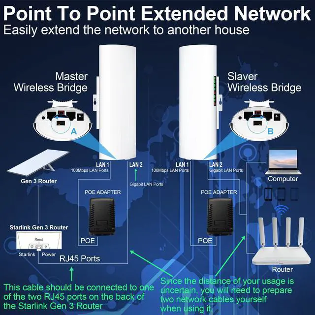 Long Range Capability: Utilizes the 5.8GH z frequency band to support long-range transmission up to 3km, providing reliable internet connectivity for Star Link Gen 3 routers and Starlink WiFi extenders.