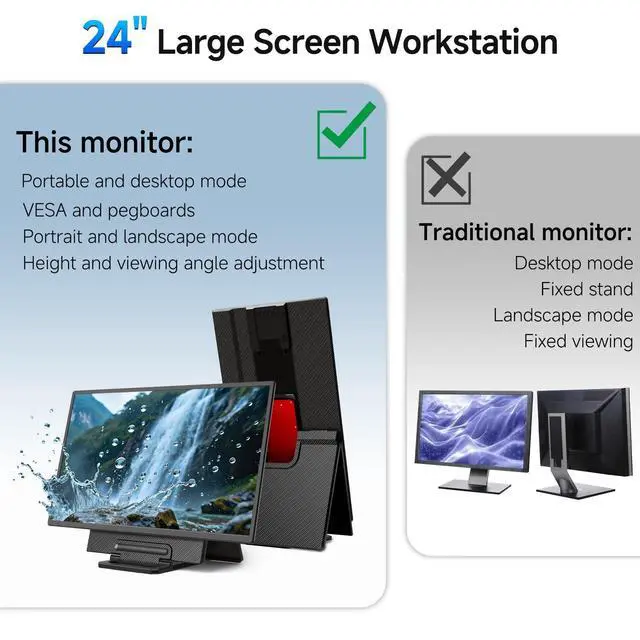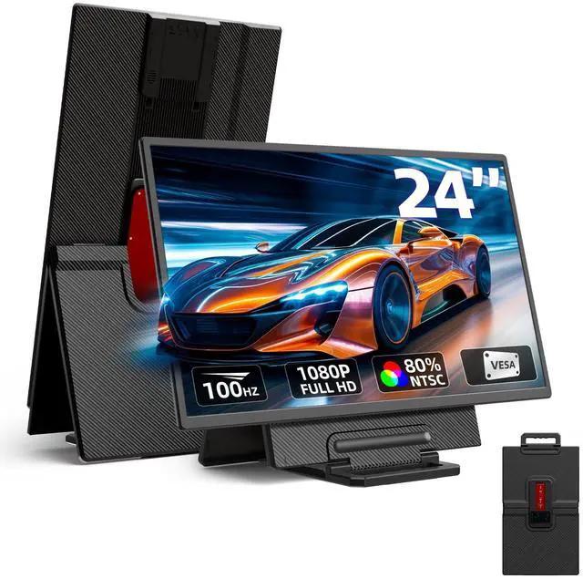 24" 100Hz Portable MonitorThis 24-inch portable monitor delivers Full HD clarity, a 100Hz refresh rate, and 111% sRGB color coverage, with wide 178 viewing angles. It's your ideal portable screen for expanding workflows and enjoying entertainmentanywhere, anytime. ^^ Portability Meets PerformanceThe 24-inch screen size offers ample display space while maintaining portability. At the same time, the detachable bracket can be used as a portable protective case to provide protection for large portable monitor. And it also supports reverse charging. This means you can easily use it in various environments, whether it's your office home or travel.