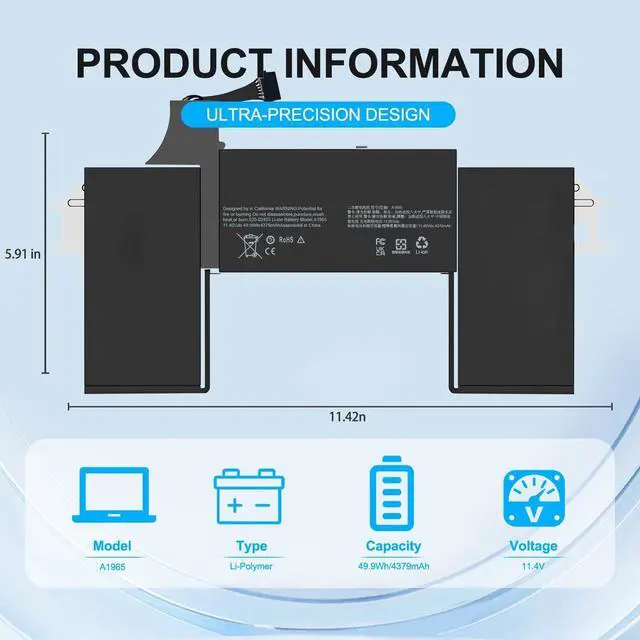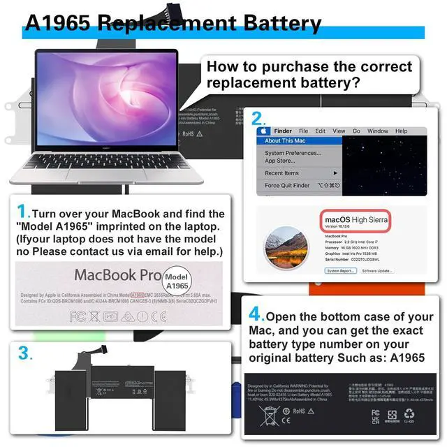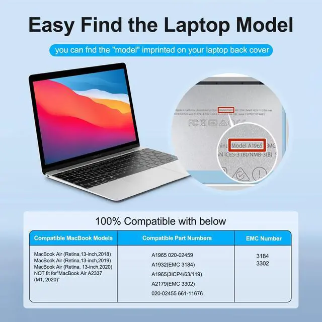 Replace Part NumberCompatible with MacBook Air A1965 020-02459 A1932 (EMC 3184) A1965(3ICP4/63/119) A2179 (EMC 3302) 020-02455 661-11676 Laptop Battery ^^ Compatible ModelsReplacement for MacBook Air 13" 13.3" Late 2018 2019 A1932 (EMC 3184), Early 2020 A2179 (EMC 3302) A1965 Notebook Battery ^^