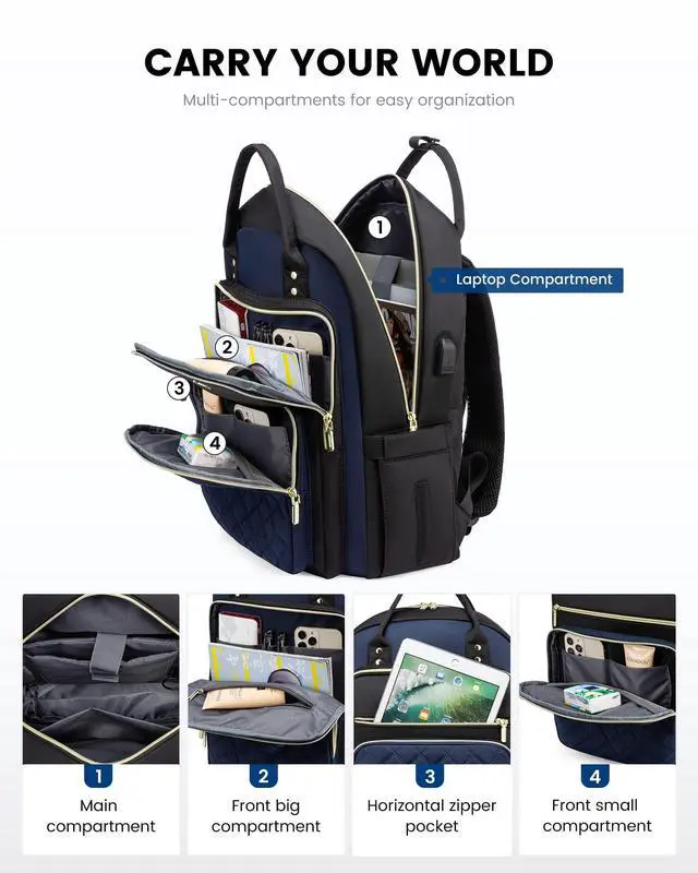 It easily accommodates your daily needs or items required for a three-day trip ^^: This backpack features ergonomic breathable mesh shoulder straps and a large quick-grab top handle. With 18 pockets, multiple compartments, and multiple pocket divisions, you can keep your items organized and easily find what you need. It is ideal as a work, college, or travel backpack ^^ Laptop