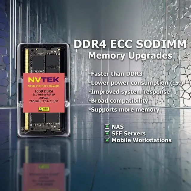 NVTEK Develops NAS Memory Upgrades that are Compatible with all Major Brand Laptops, Desktops, PC Motherboards, AIO All-In-One PC's, Small form factor Computers and NAS Storage Devices Utilizing ECC Unbuffered SODIMM's. ^^ Our Memory Upgrades are the Most Budget Friendly Way to Maximize Productivity and get the Best Overall Performance from Your NAS Device. ^^ All Modules are Built using Major Brand Chipsets and then Extensively Tested to Ensure Reliability and Compatibility. ^^ No-Hassle Lifetime Replacement Warranty and the Best IT Support in the Business. ^^ NVTEK, The Best NAS Memory in the Business, Satisfaction Guaranteed.