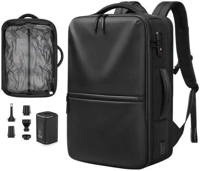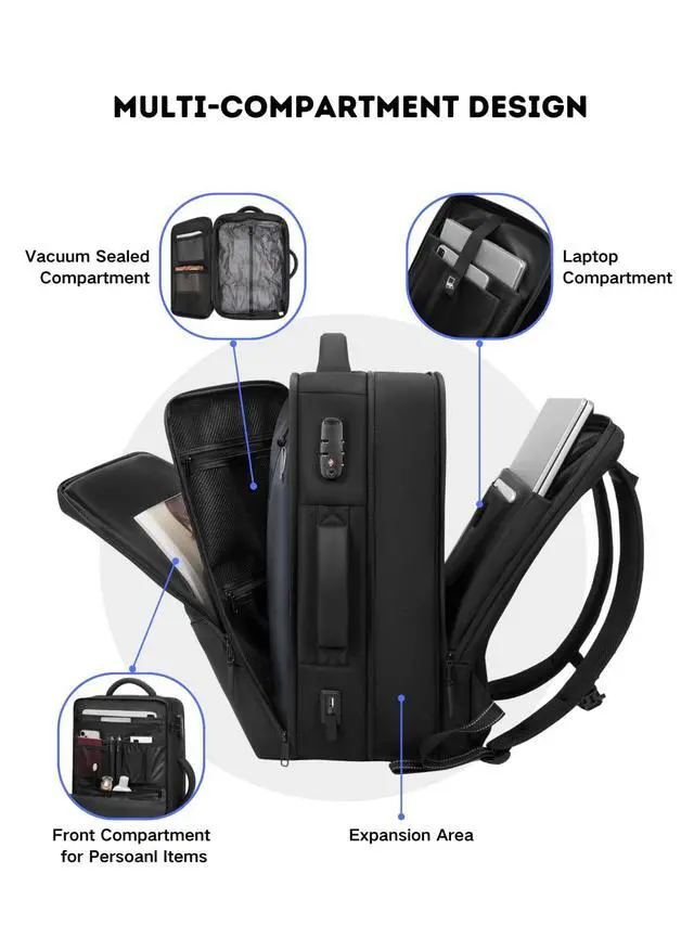 Features 3 dedicated zones: a quick-access front pocket, a massive center compartment for vacuum-sealed clothes, and a padded rear sleeve for laptops and gadgets. ^^ External USB Charging PortStay powered on the go with the convenient external USB charging port (power bank not included). Charge your devices seamlessly while navigating airports or city streets, keeping you connected throughout your journey. ^^ Ergonomic Design for Maximum ComfortDesigned with breathable honeycomb padding and S-shaped ergonomic straps to balance the weight of a 70L load. Featuring an adjustable chest buckle for stability, its the perfect companion for business professionals and heavy travelers.