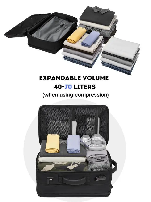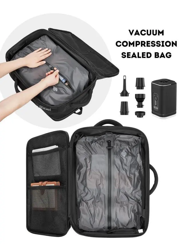 Revolutionary Vacuum Compression SystemMaximize your packing potential with the built-in airtight compression zone. Using the included electric pump, you can compress bulky items and save up to 50% more space. With a massive 70L capacity, its the ultimate solution for long-term travel. ^^ 70L