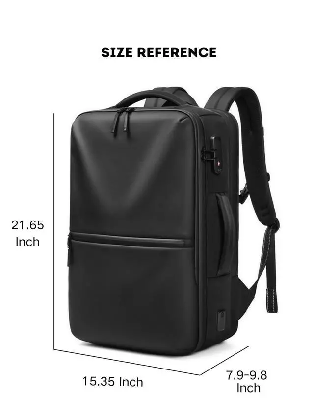 Expandable & Airline ApprovedDimensions: 39 x 20 x 55 cm ( 15.35"W x 21.65"H ). Depth expands from 20cm to 25cm ( 7.9" - 9.8" ). Engineered to maximize overhead bin space, it offers the storage of a suitcase with the portability of a backpack. ^^ TSA Integrated Lock & Tri-Zone StorageUpgraded with an integrated TSA-approved combination lock for maximum security.