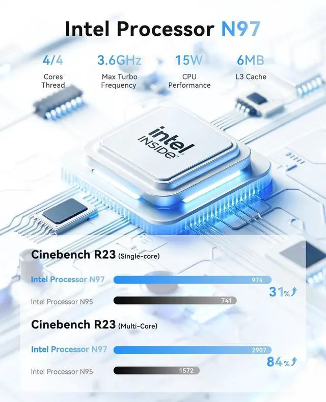 Mini PC V1 is powered by Latest 12th Gen processor Alder Lake-N97(4Cores/4 Threads, 6M In-tel Smart Cache, 2.0GH z, MAX TO 3.6GH z), delivers more than 27% higher performance than N100 (Reference from Cinebench R23). Performance at least +30%, GPU at least +21% compared with the previous CPU - N95/N5105/N5095. Remarkably power-efficient at 15W, it outperforms its predecessors, even rivaling some mainstream mobile processors from the past. Whether its for business, family entertainment, school, research, or social media, this mini PC has your needs covered! ^^ Vista Mini V1 Computer is equipped with a 16GB DDR4 and a 512GB M.