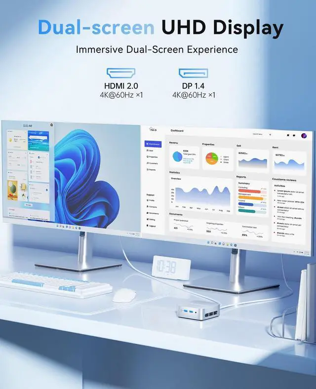 2 2280 SSD, which allows the small PC to run several high performance operations simultaneously. The IN-TEL micro desktop offers fast data reading, writing, and storage capabilities, ensuring smooth application running. If you want more storage space, you can also add M. 2 NVMe PCIe 3.0 SSD or M. 2 SATA SSD to expand the memory upgrade storage to 2TB. This means you can easily store and access a large amount of files, media, and data ^^ ACE Win11 Small PC have reliable and stable wireless connection, opening websites in seconds, watching movies without buffering and downloading files smoothly.