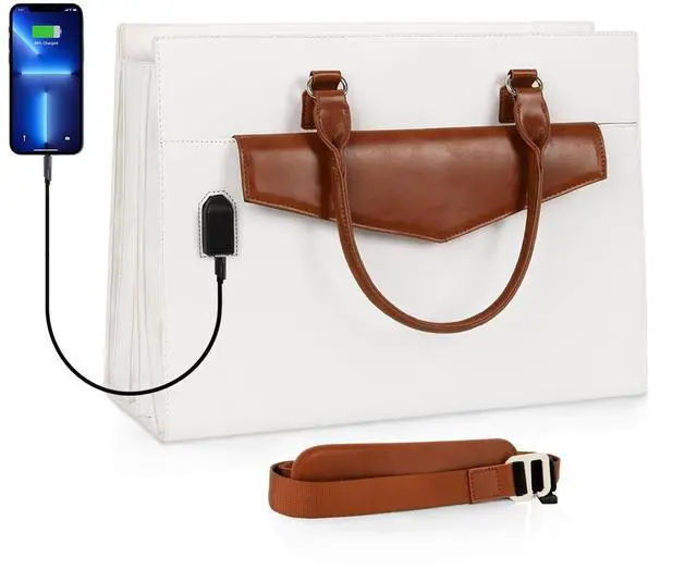 USB Charging Port: Connect the power bank to built-in USB cable port, and use your own cable to connect the USB female port outside of laptop bag, then connect the phone charging port, you can charge your phone while walking or shopping conveniently. 5. Keychain strap inside leather laptop bag for women can help get your keys easily when opening door without taking off it, save your time. 6.
