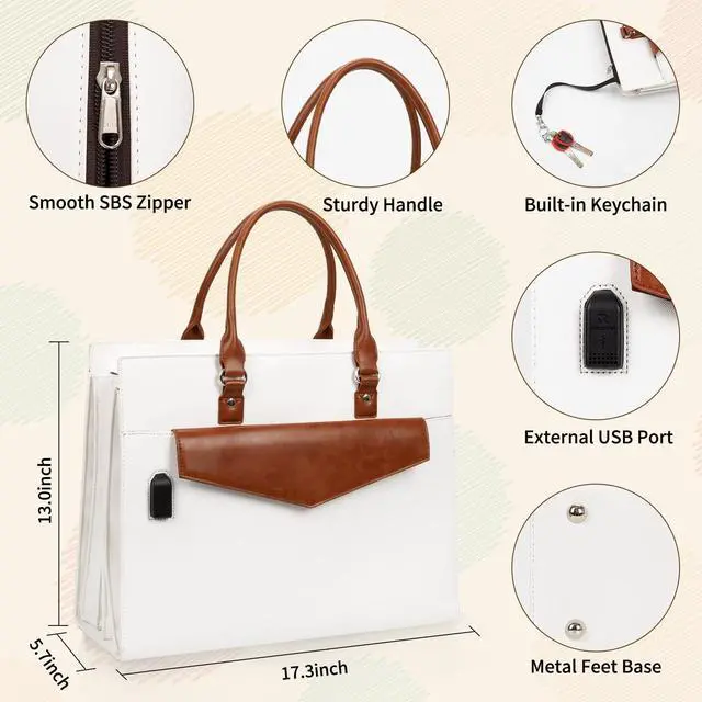 Durable & Elegant: Large laptop bag for women made of water-resistant and wear-resistant PU leather, which is not easy to be out of shape. Laptop tote bag with high quality metal accessories, zippers, bottom studs, comfortable handles and sturdy shoulder straps.