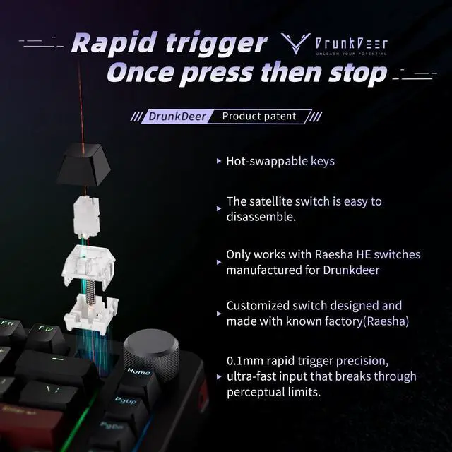 Rapid Trigger: Triggered once pressed, reset once released. Sensitivity range 0.1 - 3.3 mm, adjustable accuracy is 0.1 mm. Smoothly adjusts key action to allow mid-motion repeats without locking in actuation points. Players are free to customize it to their needs, giving them an edge in FPS and rhythm games such as Valorant, osu!. ^^ Last Win ModeWhen two keys are selected, the last keystroke is prioritized without having to release the previous one. For example, in games such as CS2 or Call of Duty, when you press the opposite arrow key, the last key you pressed takes precedence, making it easier for you to quickly change direction without releasing the first key and enjoying more of the game. ^^ Release Dual-Trigger Mode2-in-1 Action Keys, each key can execute two distinct actions based on press and release. In CS2, you can set both forward and backward movement to a single key, allowing you to achieve perfect quick stops by simply pressing and releasing the same key. ^^