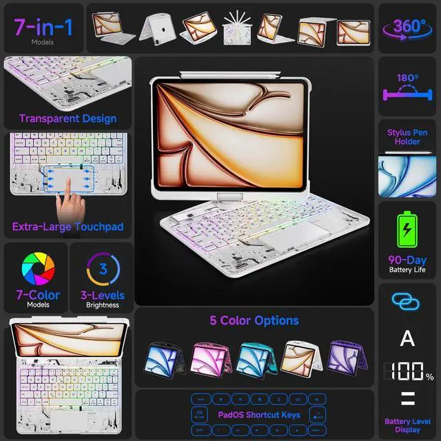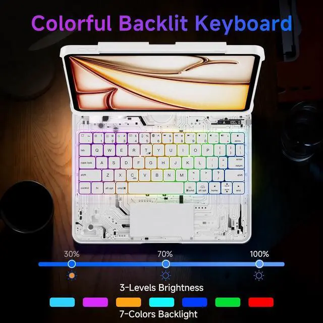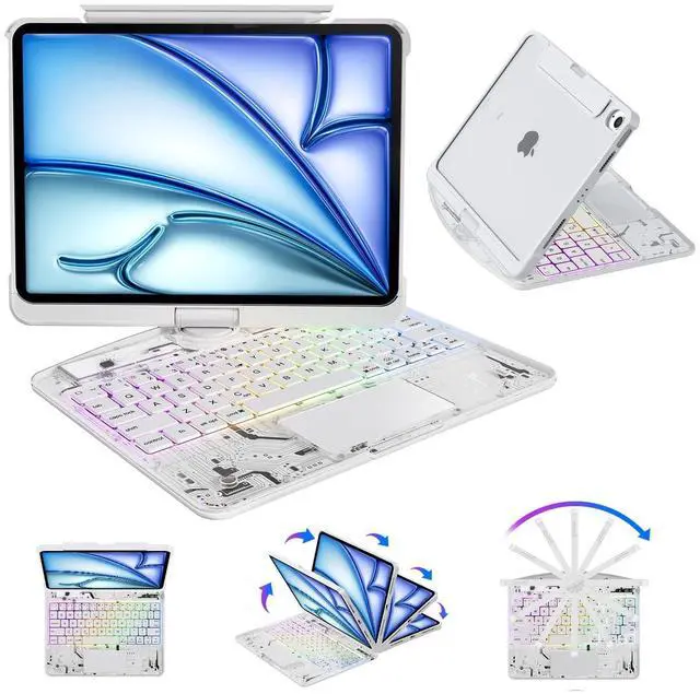 Unique Clear Design AND Multiple Compatibility Designed exclusively for iPad Air 13 inch (M3 2025 / M2 2024), iPad Pro 12.9 inch (2022/2021/2020/2018), models (A2898A2899A2900A3268A3269A3271A2436A2437A2764A2766A2378A2461A2379A2462A2229A2069A2232A2233A1876A2014A1895A1983). Please confirm your iPad model before purchasing. ^^ 7 Colors RGB Backlit Keys AND 3 Adjustable Brightness Levels The Clear ipad keyboard case comes with 7 different color-coordinated RGB backlit, and the backlit projects beautiful colors through laser-etched key characters and letters. 7 RGB colours backlit keys for comfort and productivity in any dimly lit area. ^^ 360 Rotatable Stand AND 7 Viewing Angles Effortlessly pivot your iPad for typing, working, sketching, watching videos, or video calls.