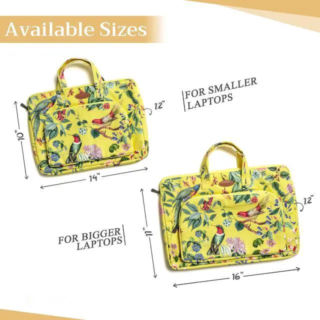 Artsy Designs and Vibrant patterns in vibrant colors provide huge visual interest, setting our bags apart. It is a versatile choice for just daily use, travel or commuting and a true delight to carry around ^^ Comes in two sizes o Small 14 Width, 10 Length, 1.2 Deep (Outer dimension) Compatible with 12- 13.3 Laptops / Ultrabooks, 13- 13.5 Laptops / Notebooks / Ultabooks. o Large 16 Width, 11 Length, 1.2 Deep (Outer dimension) Compatible with 15 Macbook air / Macbook pro, 15.3 ipad pro and most 14- 14.56 Laptops / Notebooks / Ultrabooks ^^ There is an extra removable holder on the handles.