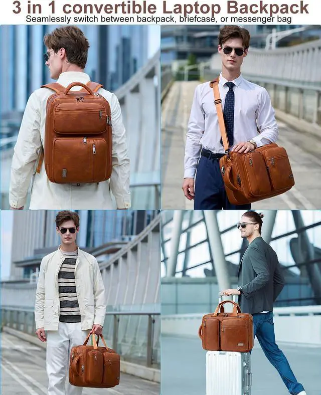 Laptop Backpack: Seamlessly switch between backpack, laptop briefcase, or shoulder messenger bag. Great for both formal business and casual needs. Durable & Comfortable Vegan Leather Messenger Bag for Men WomenOur mens laptop backpack/briefcase is made of waterproof faux leather with good stitching, sturdy zippers and metal hardware. Well-made and longer lasting.