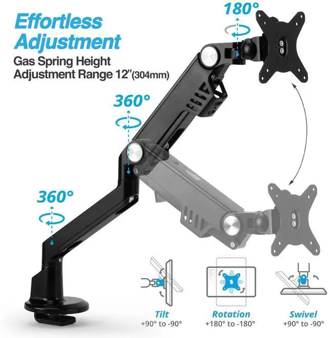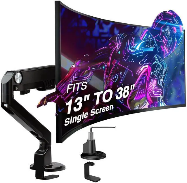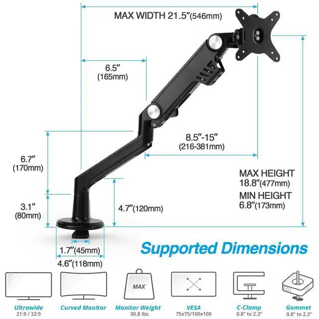 FITS 13" TO 38" SCREEN - Single monitor desk mount fits most flat/curved/ultrawide computer monitor weighing between 9.5 lbs to 30.8 lbs ( 4.3 kg to 14kg) with VESA 75x75mm or 100x100mm mounting holes. IMPORTANT NOTE The gas spring is set around 26lbs ( 11.8 kg), and the tilt systems is set at maximum capacity. ^^ SAVE VALUABLE SPACE - Heavy-duty metal base only take up 4.6" x 4" (117mm x 102mm) desk surface. The c-clamp mounting options support up to 2.3" (58mm) desk thick. ^^ ERGONOMIC VIEWING HEIGHT - Premium gas spring monitor arm assists height adjustment from 6.6" to 18.8" (168mm to 478mm), which passes 10, 000-cycle motion test.