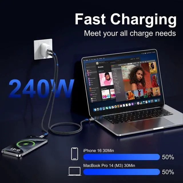 Charging Cable: USB C cable fast charging supports 240W (48V 5A) fast charging and is backward compatible with PD 3.0 /QC 5.0 QC 4.0 QC 3.0 (100W/65W/45W), quickly charging iPhone 15% to 90% and MacBook Pro 88% in 35 minutes. A USB Type-C cable can quickly charge almost all USB-C devices and is compatible with thunderbolt 3/4 devices ^^ Safe and