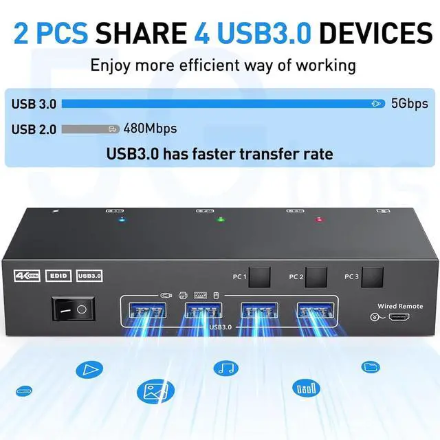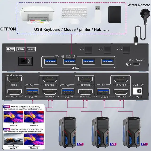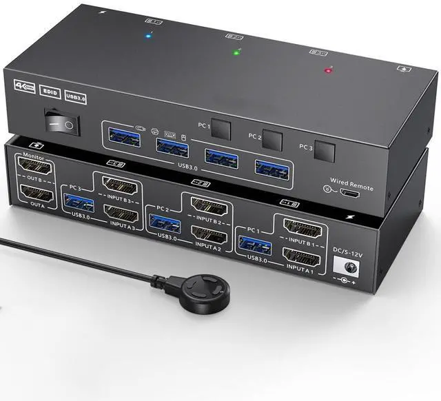 CONVENIENT TO USE: With the HD Multimedia Interface KVM Switch, you can control 3 computers or laptops using a single wired or keyboard and mouse. You can also share four USB 3.0 devices and 2 monitors in either extended display or duplicate display mode.