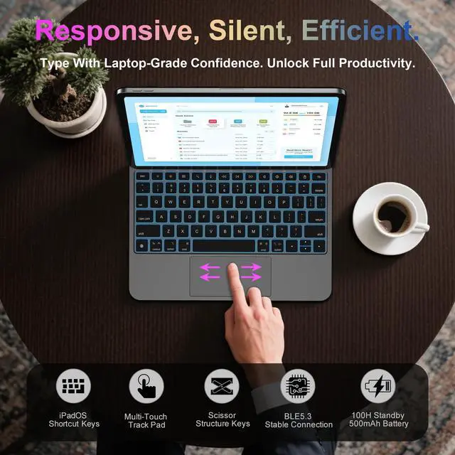 Larger Glass Trackpad: The upgraded glass trackpad supports 18 multi-touch gestures and delivers subtle haptic feedback with smart palm rejection. Enjoy laptop-like precision as click, scroll, zoom, and switch between apps, streamlining tasks like document editing, web browsing, and creating presentations.