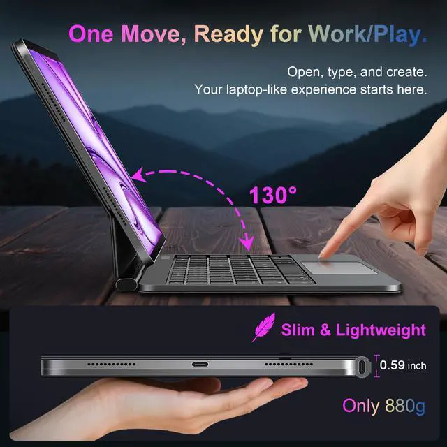 Full Protection & Go-Anywhere Power: Crafted from premium PU leather and durable ABS, this keyboard case combines style with serious protection. At just 880g and 0.59 inch thick, it offers front and back coverage without bulk. The stain-resistant exterior is easy to clean, while the soft interior keeps iPad secure and scratch-free. A built-in 500mAh battery delivers up to 200H of use with the backlit off, making it the ideal travel-ready accessory that works instantly.