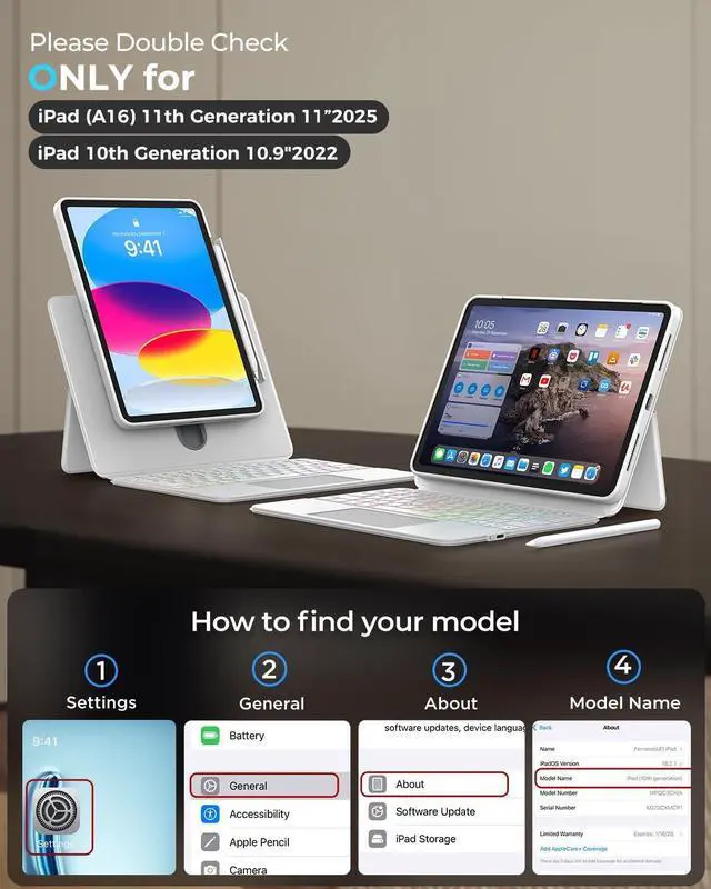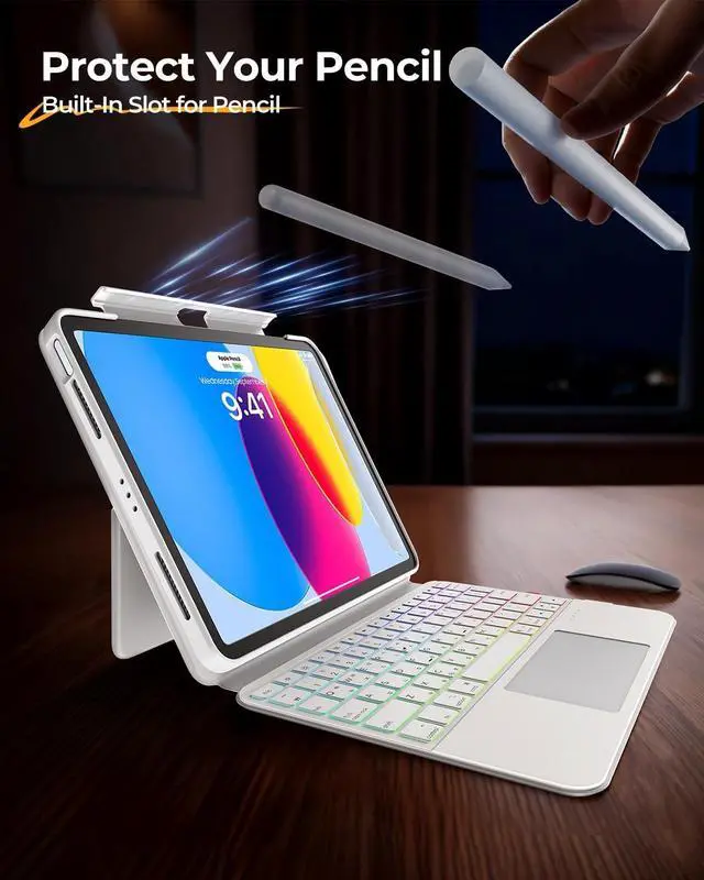 Rotation: Tailored Comfort. The built-in adjustable stand and 360 hinge let you find the perfect viewing angle. It offers raised screen view for better posture and portrait mode for FaceTime, adapting to your needs with ease. Whether sketching, typing, or presenting, it ensures the optimal viewing and working posture. ^^ Multi-Touch Trackpad, Gesture Support & 7-Color Backlit Pro Design All Scenarios Ready: Navigate like a pro via a high-precision trackpad with native iPadOS gestures. Swipe, scroll, and switch apps intuitively to boost workflow. The classic black keyboard, blending business style and customization, has 7 adjustable backlight colors for dim settings or workspace flair.