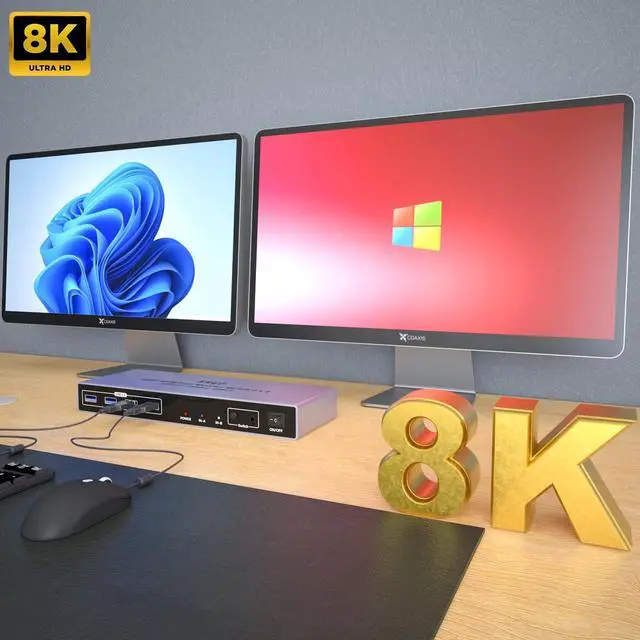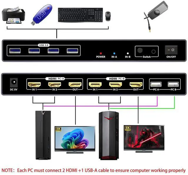 NOTE: 1. This KVM switch is not compatible with those host devices that have only USB C ports and do not have any USB A ports. 2. Not supported for use with docking station. 3. If you connect a wireless keyboard and mouse, please ensure that its working range meets the product requirements (within 1m/ 3.3 ft for a single USB device, and within 0.3 m/ 0.98 ft for multiple USB devices). ^^ Resolution Notes - KVM switch HDMI does support 8K, 4K and other resolutions, KVM is just a pass-through switch, so if we want to use 8K resolution, the computer, monitor and HDMI cables need to support 8K at the same time. it is recommended to use an 8K HDMI 2.1 cable. ^^ After connecting the KVM keyboard and mouse, it is best to refresh the keyboard and mouse drivers for each PC to ensure that the keyboard and mouse of a single computer work normally after connecting to KVM. This way, the keyboard and mouse can be used correctly when switching between two computers. Please contact technical support through to answer any questions during use.