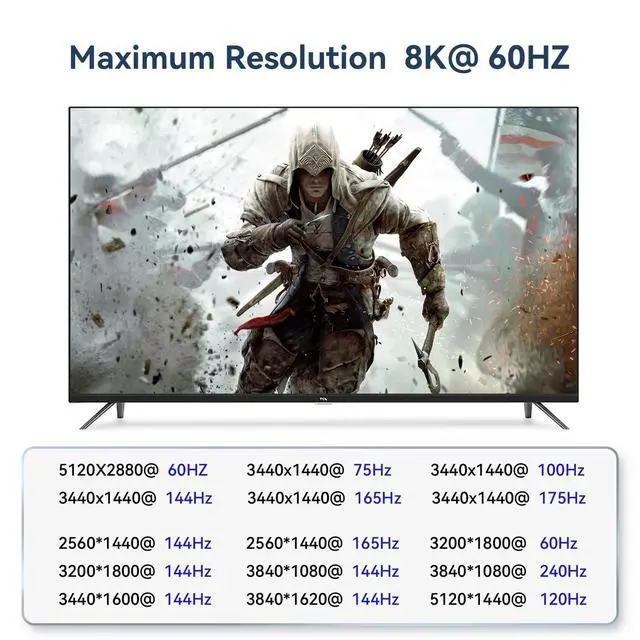 Detailed Resolusion: The DP 2.0 KVM switch 2 computers 2 monitors displayport 144hz supports max. resolution of 8K@60Hz (No Dsc) dual computer dual monitor, 8K@60Hz, 4K@144Hz, 4K@240Hz, 2560x1440@144Hz 165Hz and 5120*1440@120Hz 1440P 60Hz 75Hz 100Hz 120Hz 144Hz 165hz 175hz 240hz.