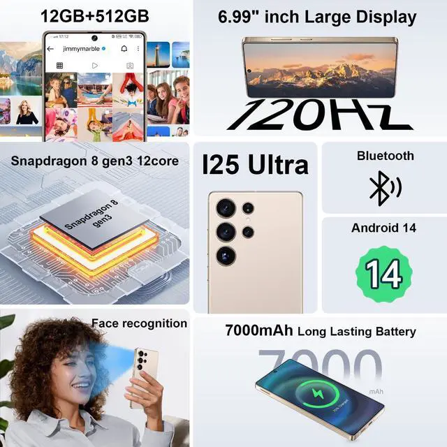 Snapdragon8 Gen3 unlocked Android cell phone powerful by Snapdragon8 Gen3+ 5G Octa-Core Processor, Up to 12GB RAM and 512GB ROM Supports expandable storage up to 128GB, storage card to easily store your favorite music videos photograph it offers you a capacious room to keep all your favorite things ^^ 68MP+108MP+ 6.99"HD Screen108MP main camera and a 68MP front facing camera, Equipped with extra-large 6.99"HD Screen High Definition Storage of Pictures and Videos Recording of Good Life ^^ Dual SIM and Global Band 5G PhoneDual SIM & 3 Card Slots, I25 Ultra Smartphone adopts 2+1 card slot design, supports two 5G SIM cards, you can use the second number without carrying an extra mobile phone.