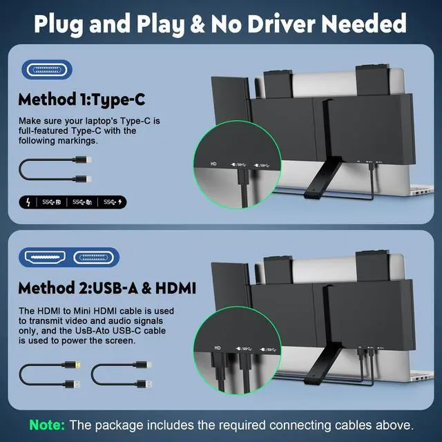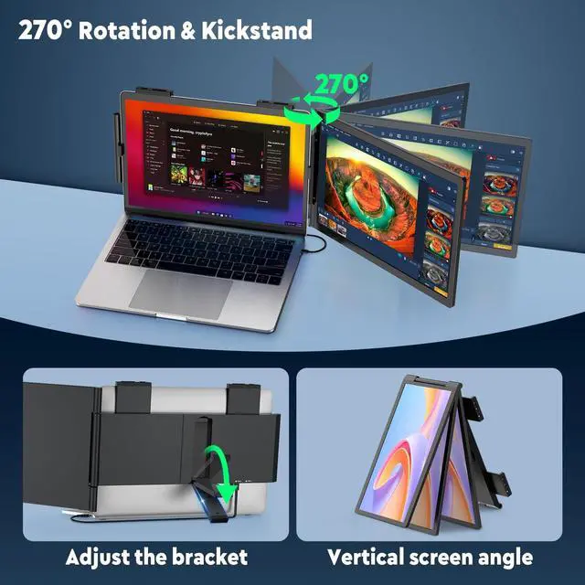 In addition, the laptop extender screen support 270 rotation, and the bracket can be adjusted 180, you can adjust according to your own needs. ^^ Portable & Customize ModeThe portable monitor weighs only 2lbs, easy to carry, fold or unfold, this travel monitor for laptop is a great choice for office meetings, home work and business travel, entertainment games. The laptop dual monitor supports three modes: Extended Mode, Mirror Mode, Portrait mode, allow you to choose the appropriate mode in different occasions. ^^ Plug & Play Without DriverLaptop extended monitor can achieve one USB-C cable connection, no need drive. Make sure your laptop has a full-featured C port or an HDMI port, the extra screen can work with most of 14"- 16" laptops!!! Compatible with Mac, Windows, Android, PS5, Xbox, Switch. ^^ Reliable ServiceThe monitor extension for laptop offers 1-year warranty, lifetime support. If you notice missing accessories or have inquiries about connectivity, feel free to contact us. The packaging contains all the necessary cables, so you can purchase with confidence.