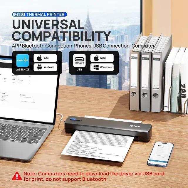 Note: Always match the paper size setting on your phone/PC to the paper used ^^ High Compatibility-- Portable Printer supports iOS 13 or above & Android and PC, NOT support Chromebook. For mobile printing, simply download the "Labelnize" app to print wirelessly via Bluetooth. PC users must install drivers either from polono. com or the included USB drive ^^ Inkless Printing-- Only Support US Letter Size & A4 Size Thermal Paper. This portable thermal printer utilizes advanced direct thermal technology to deliver inkless, environmentally friendly printing without the need for ink cartridges. The thermal printer supports both US Letter and A4 size thermal paper, with 20 sheets of US Letter paper included in the package ^^ Clear Printing--POLONO D810 Portable Inkless Printer delivers crisp, high-resolution prints with advanced inkless technology. This wireless printer operates for up to 49 minutes on a single charge, producing approximately 200 sheets ^^