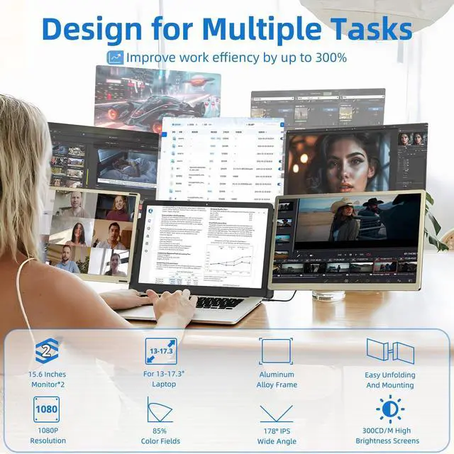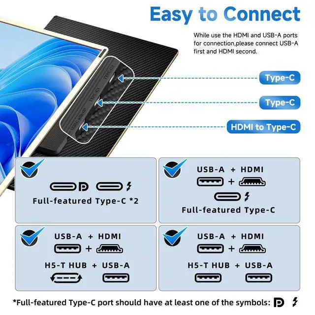 ^^ Universal Compatibility: Effortlessly connect to a wide range of devices with HDMI, USB-C or H5-T connections. This monitor offers instant compatibility with Windows and MAC, Chrome OS, Android, Linux, requiring no complicated software or drivers. It fits a wide range of laptop sizes from 13" to 17.3".