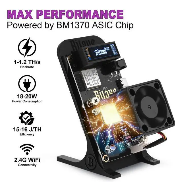 BM1370 ASIC Chip: Powered by a single high-performance BM1370 ASIC chipoptimized for SHA-256 Bitcoin miningthe Bitaxe Gamma 601 delivers a reliable hashrate of 1TH/s to 1.2TH /s. Boasting an impressive energy efficiency of 15-16J/TH, it operates on just 18-20W of power, making it ultra-cost-effective for home use. Perfect for beginners, blockchain enthusiasts, or anyone looking to experience solo mining without heavy electricity bills ^^ Plug-and-Play Simplicity with 2.4G WiFi &
