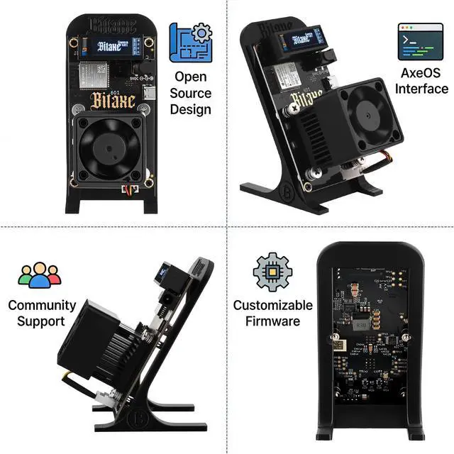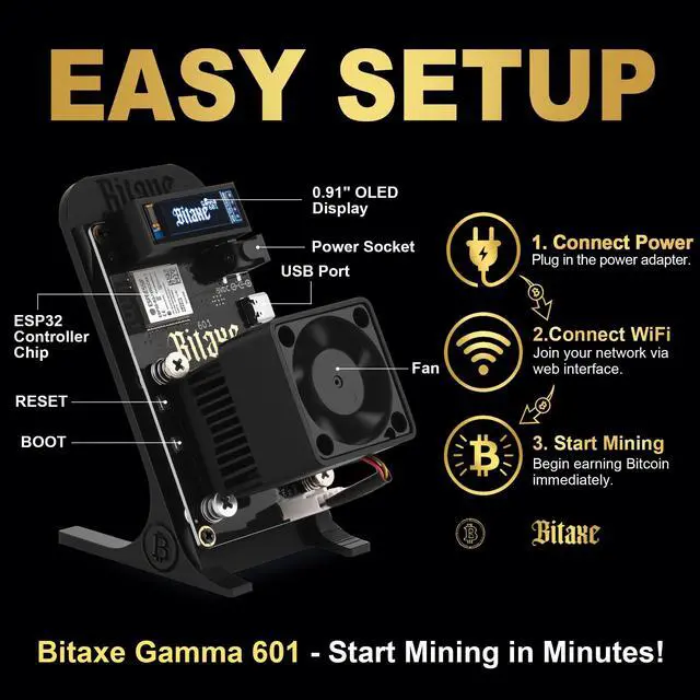 OLED display: Easy to use! Connect to your home 2.4G WiFi via the user-friendly AxeOS interface, input your Bitcoin address, and start mining in minutes. The 0.96" OLED display shows real-time hashrate, temperature, and network statuskeep tabs on your miner at a glance. Wireless connectivity eliminates cable hassle, while remote management (via AxeOS web dashboard) lets you control it from anywhere in your home ^^ Open Source Freedom & AxeOS Compatibility: Built for tinkerers and learners alike, the Bitaxe Gamma 601 is fully open sourcecustomize firmware, tweak performance settings, or dive into the community-driven AxeOS ecosystem. It supports all major mining pools and solo mining protocols (Stratum V1), with free updates for continuous feature improvements. Join a global community of open-source miners for tutorials, firmware optimizations, and technical supportideal for anyone wanting to learn mining mechanics ^^ Ultra-Quiet & Compact Design for