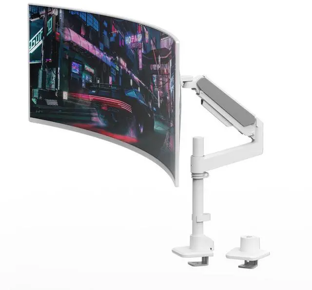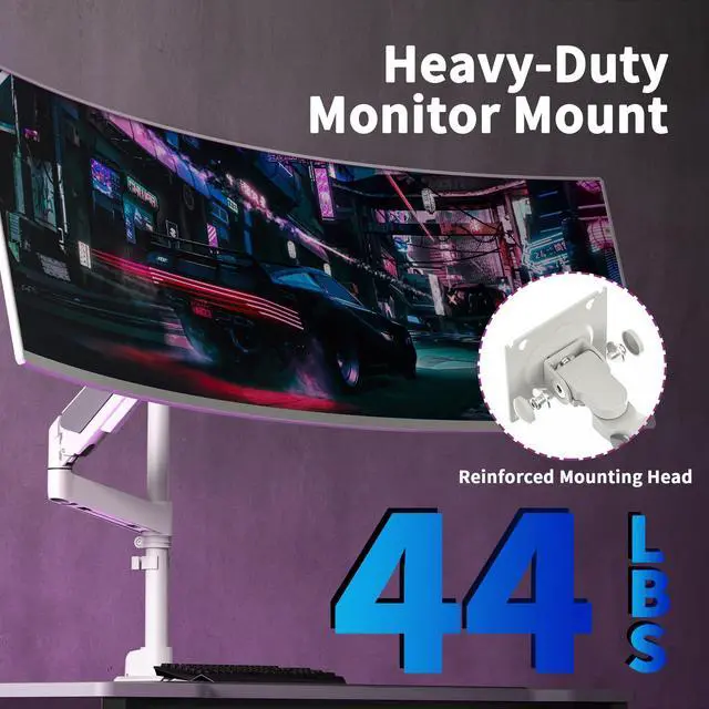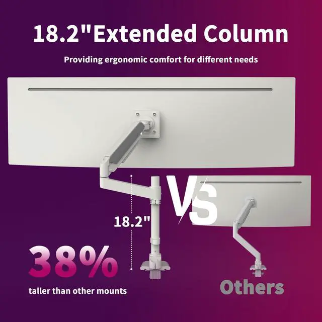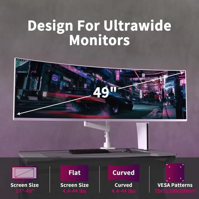 Built for Ultrawide MonitorsThis heavy-duty adjustable monitor arm is compatible with most flat, and curved computer monitors ranging from 17'' to 49''. The monitor mounts for 2 monitors can hold monitors up to 44 lbs for each arm. Compatible with the Samsung, LG, and other 49" ultrawide monitors, you need to prepare a VESA mount adapter if your monitor does not have VESA holes. ^^ Smooth Full-Motion ControlThe monitor arm supports to adjust the height 2.4 -28"), rotation (360), tilt(+90/ -45, and swivel180. Achieve your ideal viewing position or configure dual screens in stacked/vertical layouts with effortless precision.