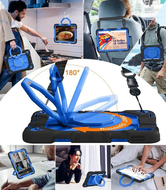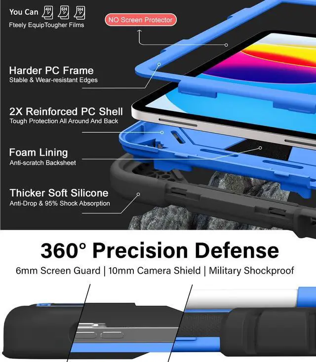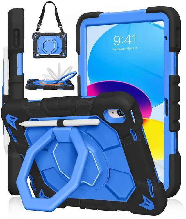Generation 10.9 -inch (2022): Models A2696/A2757/A2777. Confirm back "A" number before choosing this case to protect your investment. ^^ Military-Grade Shock AbsorptioniPad 10.9 inch 10th gen case with reinforced PC frame and thickened silicone absorbs massive impacts, guarding against corner drops and bumps during travel or kids' playbuilt to survive bumps like a tank. ^^ 360 Precision DefenseiPad 11th generation kids case features raised bezels to shield the screen from frontal drops and a deeper camera cutout to protect lenses. Added foam lining inside the iPad 11/ 10.9 inch case prevents scratches, defending your device from daily chaos. ^^ Anti-Bending Ring StandiPad a16 case with a reinforced PC core withstands 10, 000+ rotations and extreme temperatures. This tank-tough ring stand resists cracks and warping, made for heavy-duty daily use. ^^ Dynamic Grip, Carry & View360 Rotating & 180 Folding ring stand enables it grip One-handed or hook somewhere + adjust 20-80 for drawing/typing/viewing. Adjustable detachable strap frees hands- Perfect for Campus, Home or Travel ^^ Perfect Fit & Pencil HolderiPad 10th gen case for kids offers precise cutouts for all portsuse and charge like a bare iPad. The back slot locks your pencil securely, ending lost-pen panic whether for kids or travelers.