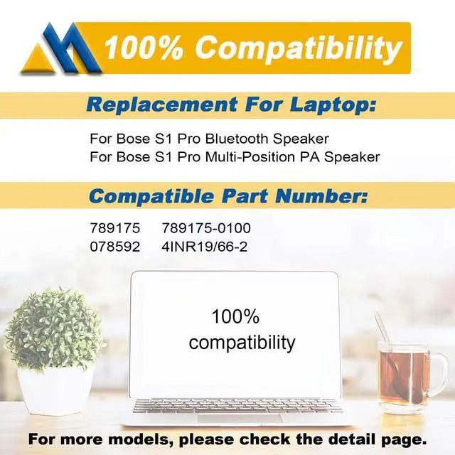 Battery type: Li-ion. (We only use grade A battery cells that provide up to 500 recharge cycles over the life of the battery. Come with screwdrivers. ) ^^ Compatible Part NumberFit for 789175 789175-0100 078592 ^^ Replacement For LaptopFor Bose s1 pro ^^ SecurityAll Mobik products are certified by UL / CE / FCC / RoHS for safety. Were so confident in the performance of our replacement laptop batteries, strict guidelines for compatibility, strict quality control standards and standards compliance for environment safety. (including short circuit, overheat, and overload protections. ) ^^ TipsIf the new battery is not recognized during the initial installation, please reinstall and check if the interface is fully connected. Discharge the new battery to 5% (not 0%), then charge and cycle 3-4 times to wake up the new battery.