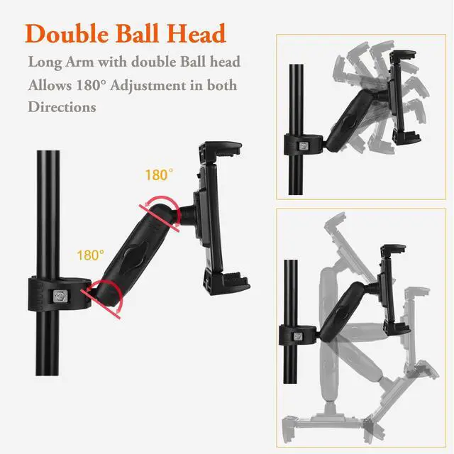 Max loading: 1.0 kg/ 2.2 lb ^^ EXCELLENT COMPATIBILITY - this iPad hold mic stand is compatible wtih screen size from 4" to 13.5" devices with thick case. all iPad series, all samsung galaxy Tab series and more, all iPhone and Android smartphone, or monitor width less than 9, 25", thick less than 0.76" ^^ EXCELLENT ADJUSTABILITY - Using double ball head design, 360 rotation allows your device in any angle adjusment to realize any angles display, such as Horizontal, Vertical, face upward and downward or tilt ^^ SUPER STABILITY - the double sockets arm and supper clamp useing Nylon+Glass fiber material, not plastic, it provdes stong clamp force, it maks the tablet more safely and securely, not drift down when you touch it or use it. ^^ SUPER PIPE CLAMP - the supper clamp can quickly and securely attached to any available pole, such as the upper pole of the microphone stand, boom, music stand, open size from 1.53 cm/ 0.6" to 4.0 cm/ 1.57"