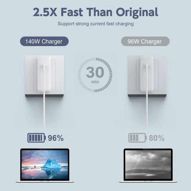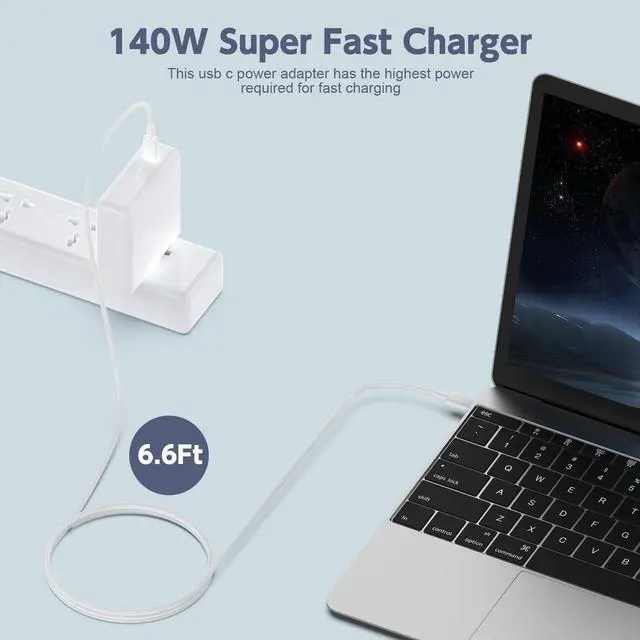 Super Fast Charger140W USB C Power Adapter can fully charge your 2023 Pro 16 in only 1h 40 mins and charge it up to 50% in only 32 mins as fast as to fully charging a cellphone. Compatible with USB C 30W, 61W, 87W, 96W models ^^ Wide CompatibilityCompatible with Pro 16 inch(M3, 2023), Pro 16 inch(M2, 2022), Pro 16 inch(M1, 2021), Pro 14 inch (M3 2023), Pro 14 inch (M2 2022), Pro 14 inch(M1, 2021), Air 13 inch(M2, 2022), Air 15 inch(M2, 2023), Air 13 inch(M3, 2024), Air 15 inch(M3, 2024), model a2442, a2485, a2458, a2452, a2681, a2779, a2780 ^^ Features CertificationBuilt-in original dynamic software and hardware systems to keep Maximum Capacity to 98%, intelligently learning your daily charging routine to reduce aging and intelligently monitoring temperature to safeguard your devices, over-current, over-voltage, overheating, short circuit and other problems ^^ Portable ChargerOur 140W Power Supply extra long USB C to USB C cable is compact enough for you to charge your phone or transfer files from any other C power source such as computer or portable in different occasions such as traveling, home, car, office and so on ^^ After Sales ServiceWe have comprehensive after-sales service and provide 24 x 7 email support.