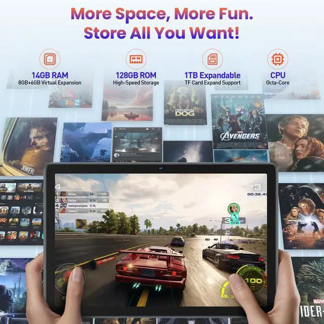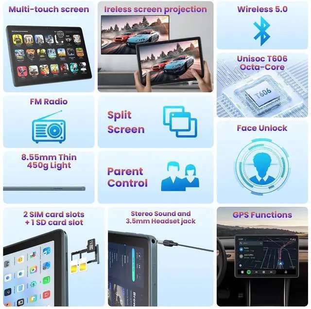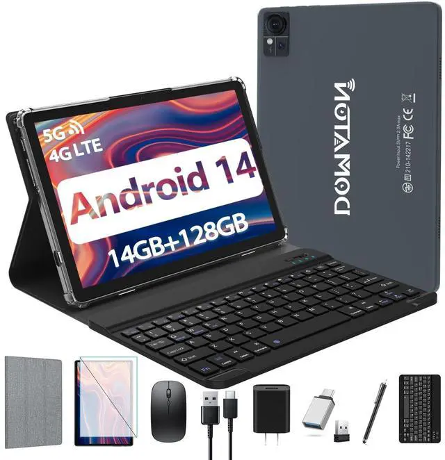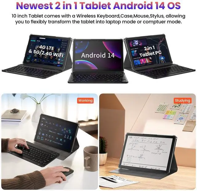Android 14 Tablet & Octa Core Android tablet features the latest operating system Android 14 Tablet enhances privacy and security and improves the overall experience of using the device through personalization features, seamless multitasking, getting rid of annoying ads, the ability to unlock the screen using facial recognition, and control over data accessed by apps. ^^ 2.4 /5G Wi-Fi /4G LTE/ BT 5.0 / GPSThis 2 in 1 tablet has built-in Bluetooth 5.0 and 5Ghz WiFi Tablet supports Dual band 5+ 2.4G hz( 802.11 a/b/g/n/ac). The 5G frequency is faster, allowing you to play games and make video calls anytime, anywhere.
