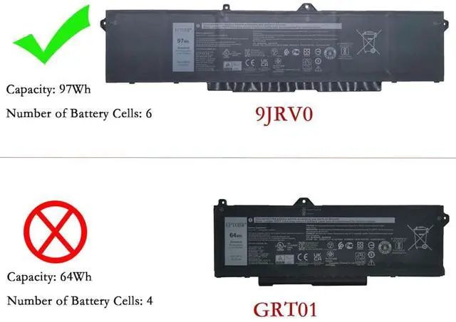 • Replace Part Number9JRV0 00P3TJ 0P3TJ 0R05P0 R05P0 05RGW 005RGW 53XP7 053XP7 (Note: the length of GRT01 battery is shorter than 9JRV0 battery, and their interfaces are different, so they are not fit for each other. If your computer is 15.6 inches, in order to save you time and money, we strongly urge you to open the back cover of your laptop and make sure that the battery model you need is 9JRV0.)