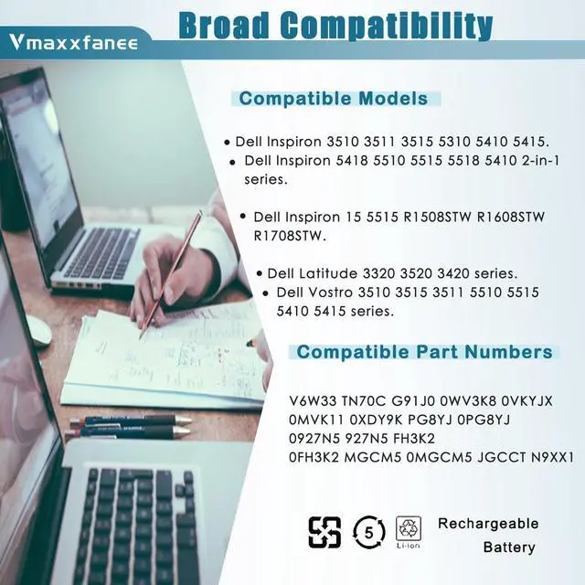 Condition: 100% brand New from Manufacturer. ^^ Compatible laptop ModelsFor Dell Inspiron 3510 3511 3515 5310 5410 5415 5418 5510 5515 5518 series, For Dell Inspiron 5410 2-in-1 series, For Dell Inspiron 15 5515 R1508STW R1608STW R1708STW series, For Dell Latitude 3320 3520 3420 series, For Dell Vostro 3510 3515 3511 5510 5515 5410 5415 series Notebook. ^^ Compatible P/N V6W33 TN70C G91J0 0WV3K8 0VKYJX 0MVK11 0XDY9K PG8YJ 0PG8YJ 0927N5 927N5 FH3K2 0FH3K2 MGCM5 0MGCM5 JGCCT N9XX1. ^^ Quality &