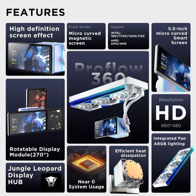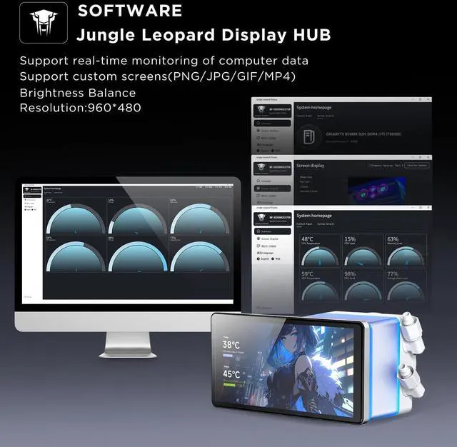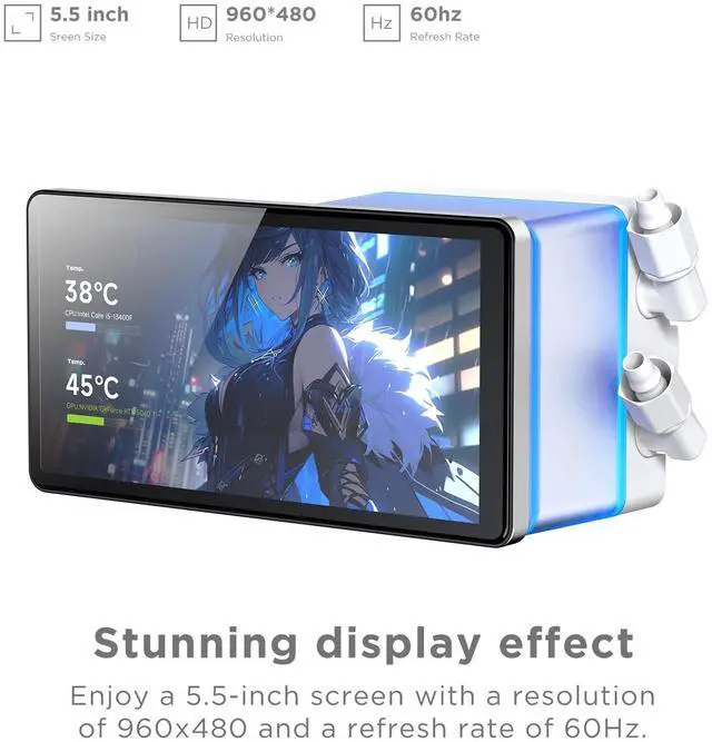[ 5.5 Inch LCD Smart Screen]Equipped with a 5.5 -inch LCD smart screen with a resolution of 480*960. 270 rotation (adjustable 90/180/270) is supported. Magnetic design for easy assembly, multi-angle display without dead angle, convenient to display customized content or hardware data ^^ [Customized Display Content] support imported video and pictures set as background, with a variety of customized design, covering video import, data display and visualization customization. With customized R&D software, the operation is intuitive and smooth, and the interface layout is clear to meet personalized needs ^^ [Better Cooling]Aluminum integrated heat sink design improves cooling efficiency by 40%.