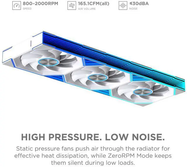 It can handle up to 320W TDP, with fan speeds of 800 - 200010% RPM, three fans with a total airflow of 165.1CFM, and an air pressure of 2.05 mmH2O, guaranteeing excellent overclocking-level cooling ^^ [Radiator Parameters]PF360 water-cooled radiator size of 379 * 120 * 27MM, waterway length of 400mm, pump speed of 2700 10%, fan size of 360 * 120 * 25mm, fan speed of 800-2000 10%, noise 30db (A) ^^ [ARGB Synchronized Lights]Siamese ARGB Infinity Mirror fans and dual-ring ARGB water-cooling headers are synchronized with the 5V 3pin on the motherboard, and 1600W colorful soft-lighting effects create cool visual effects.