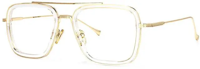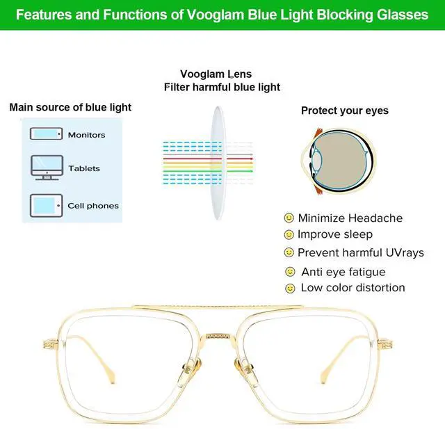 Vooglam AnyWear series glasses -- Designed with a sleek gold frame, they exude timeless sophistication while maintaining a fresh, modern appeal ^^ Use occasions -- The classic aviator shape is elevated with a minimalist, clear design thats perfect for both daily wear and special occasions ^^ TR90 material -- lightweight, pay special attention to quality, durability and comfortable ^^ Protect your eyes -- Using blue light-blocking lenses protects your eyes and reduces eyestrain, radiation, and dryness during the use of a computer, phone, TV, or other electronic product ^^ Medium size --