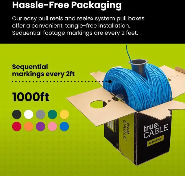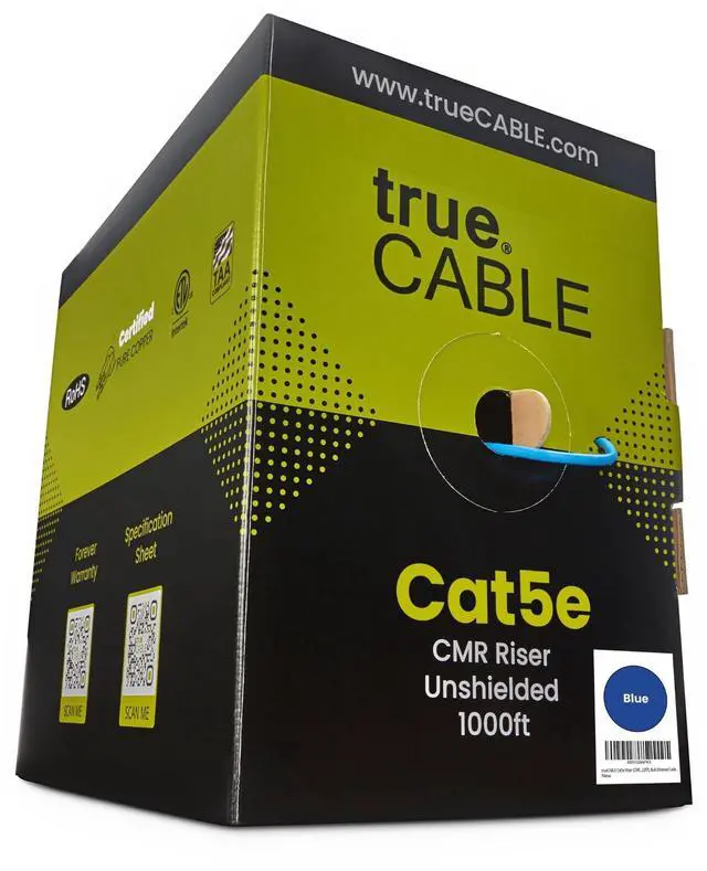 Supports Power over Ethernet: PoE/PoE+/PoE++ (IEEE 802.3 af/at/bt) 4PPoE up to 100W. ^^ [Hassle Free Packaging] 1000 feet (305 meters) comes conveniently pre-spooled in a tangle free, easy pull box so you dont have to worry about getting behind on your next job. ^^ [Solid Bare Copper Conductors] Pure bare copper conductors offer superior signal strength, conductivity, and flexibility compared to cheaper copper clad aluminum (CCA) options. Choose pure copper for a stronger, more reliable connection. ^^ [For Use Indoors] The blue riser rated jacket is for use in between floors, in wall, and non-plenum spaces. Help fires from spreading floor to floor in vertical installations with mild flame retardance. ^^ [ Certified by trueCABLE] Our data cables have been tested with a DSX-8000 Versiv CableAnalyzer and are in compliance with ANSI/TIA 568.2 -D standards, RoHS-3 compliant, and cETLus certified. Backed by our FOREVER WARRANTY. Compatibility & performance tested with trueCABLE RJ45 Connectors - B07XB3CPJK and B088KTYHMR