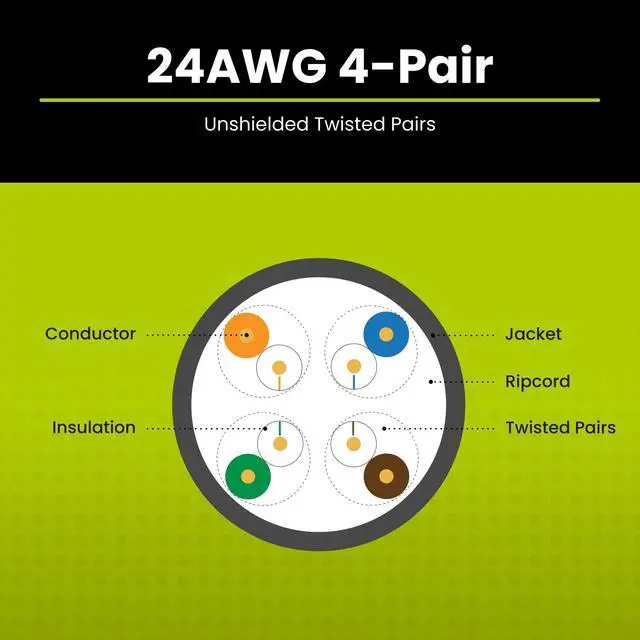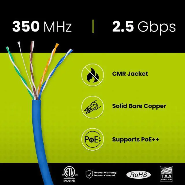 [High Performance Network Cable] This riser rated cat 5e cable is 24 AWG with 4 pairs (8 conductors). Suitable for 1 and 2.5 Gigabit ( 2.5GBASE -T) speeds up to 328 feet. Bandwidth tested up to 350 MHz.