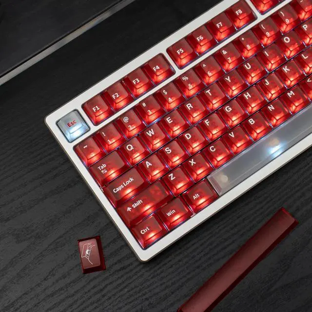 Clear Keyboard Keycaps: This is a set of 151 keys red keycaps gaming keyboard Crafted from high-transparency PC material, the casing and shine-through keycaps maintain purity and clarity. The characters and vivid patterns on each keycap sets your keyboard apart ^^