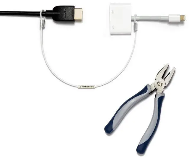 TetherTies cable adapter kit offers peace of mind by helping prevent loss or misplacement in your office or workspace. ^^ NO ASSEMBLY REQUIRED TetherTies come fully assembled. Simply place the TetherTie over or around the items you want to secure, slide the cable until it is tight, and crimp it shut. No hassle. ^^ INCLUDED CRIMPING TOOL Each purchase includes a crimping tool for quick and easy installation. TetherTies can be installed permanently in 15 seconds or less.