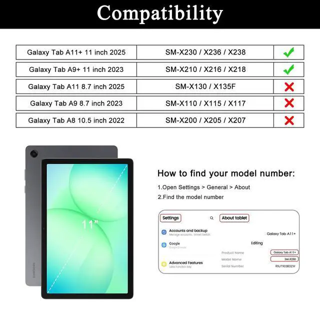 CompatibilityExclusively designed for Newest Samsung Galaxy Tab A11 Plus 11 inch(Model: SM-X230/X236/X238, 2026 Released)/A9 Plus 11 Inch(SM-X210/X216/X218, 2023 Released)ONLY. Please kindly check the model number SM-X*** at the Setting of the tablet before purchase ^^ Rugged Armor Full Protection Multi-layered hard PC back and flexible TPU bumper provide full protection against drops, bumps, and impacts, also easy to install ^^ Built-in Screen ProtectorPrevents your New Galaxy Tab A11+/A9+ 11 Inch screen from scratches without compromising sensitivity and provides full protection ^^ Built-in KickStand Functional pop-out kickstand with dual stand angles for easily enjoying movies and better working. FREE YOUR HANDS ^^ Precise Cutouts Precise cutouts and design allow easy access to all ports, sensors, speakers, cameras without removing the case