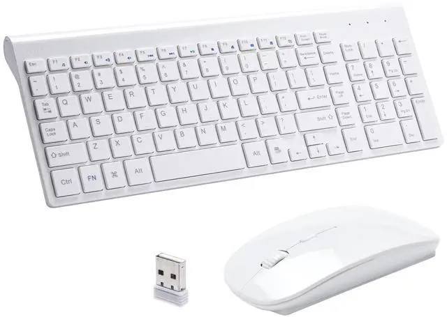 STABLE 2.4G WIRELESS CONNECTION - RVP+ ultra-slim wireless keyboard and mouse combo features a stable and reliable 2.4G connection up to 10m. A shared Nano receiver in the mouse ensures no extra software is needed, enabling instant plug-and-play. ^^ LESS NOISE AND ERGONOMIC COMFORT - Our keyboard's noise-reducing keys and silent mouse clicks promote a quiet working environment. Featuring a scissor-key switch for smooth, responsive typing and a sloped-angle design, this white keyboard and mouse combo provides ergonomic comfort to reduce hand fatigue. ^^ EASY TO USE - Plug-and-play RVP+ wireless mouse and keyboard set connects via a 2.4GH z USB receiver.