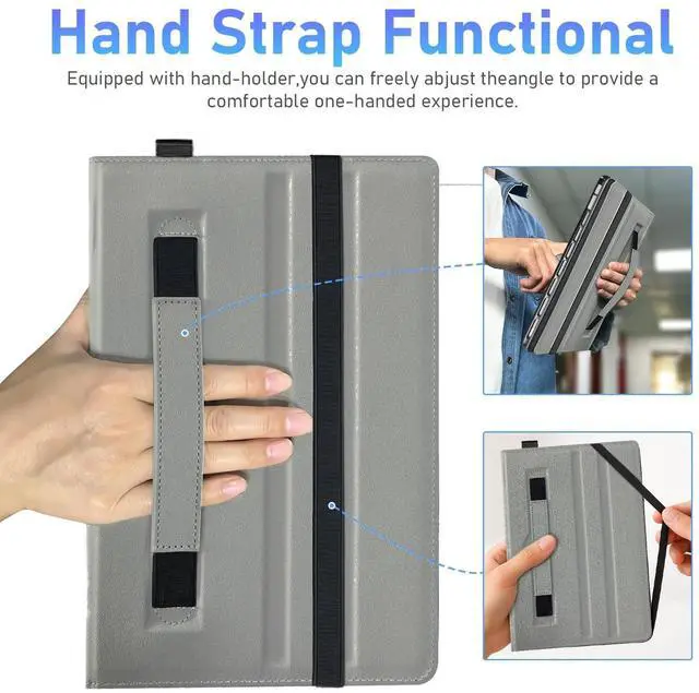 All-in-One Functional Design Front pocket for documents/cards, and a built-in pencil holder to secure your stylus. The elastic hand strap offers a secure one-handed grip for commuting or travel